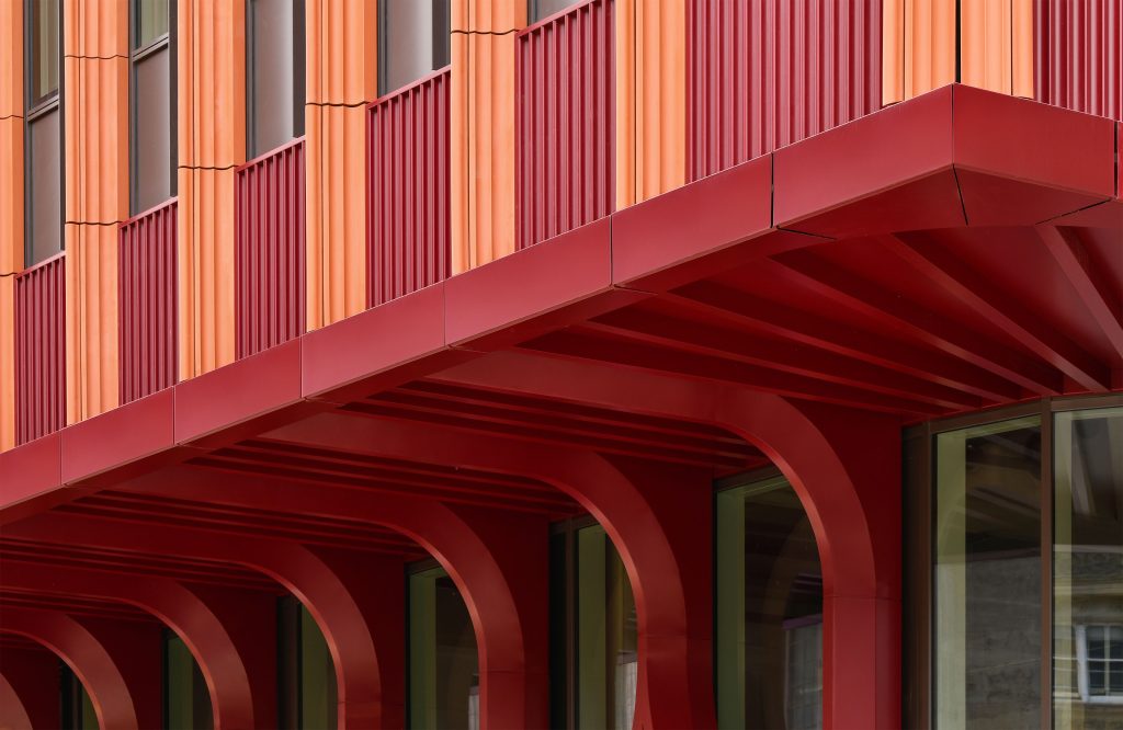 The façade is both a visual statement and a lesson in sustainable craftsmanship. More than 8,000 unglazed terracotta tiles were painstakingly installed over the course of a year, each piece fully demountable so it can be refurbished or recycled in the future. Forgoing a second kiln pass reduced embodied carbon, while the unglazed surface gives the building a warm, tactile character. On the seventh floor the façade curves inward, shifting from vertical to sloped and demanding exceptional precision from the engineering team to align corner units and maintain schedule.