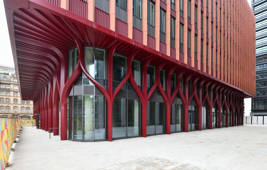 Logistics on the constrained site called for inventive solutions. Surrounded by existing buildings and a live tram line, the project relied on one of the UK’s largest hoists, the Alimak Mammoth TM 55/50. Measuring five by three metres and capable of lifting four tonnes—or 50 people—at a time, it moved ducting, plasterboard and workers efficiently, preventing delays that often plague high-rise city builds. A spider crane managed lower-level façade installation while the hoist kept upper floors supplied, demonstrating how careful planning can overcome even the tightest urban constraints.