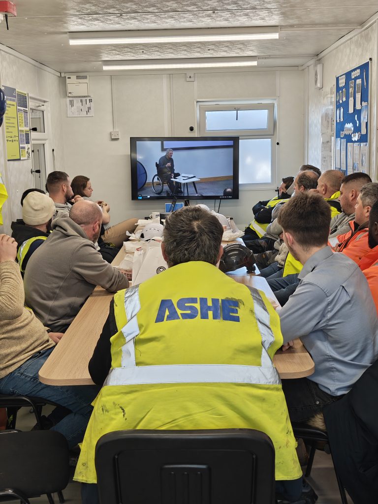 The Stand Down for Safety event saw all of Ashe Construction and Ashe Roofing’s sites stop work simultaneously for an hour to watch a hard-hitting safety talk by motivational speaker, Paul Blanchard. Paul spoke emotionally about a life-changing injury 15 years ago which left him paraplegic and wheelchair bound. Paul reminded everyone not to be complacent and explained that despite being an experienced builder and trained in health and safety, he made the fateful decision to work at height without assessing the risks and fell 12 feet. He described the toll his accident has taken on him and his family.
