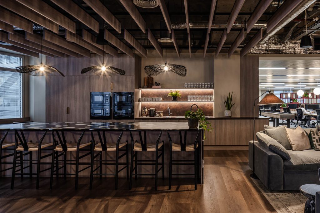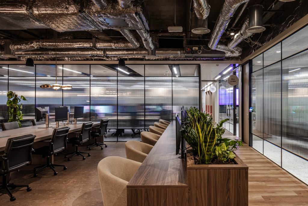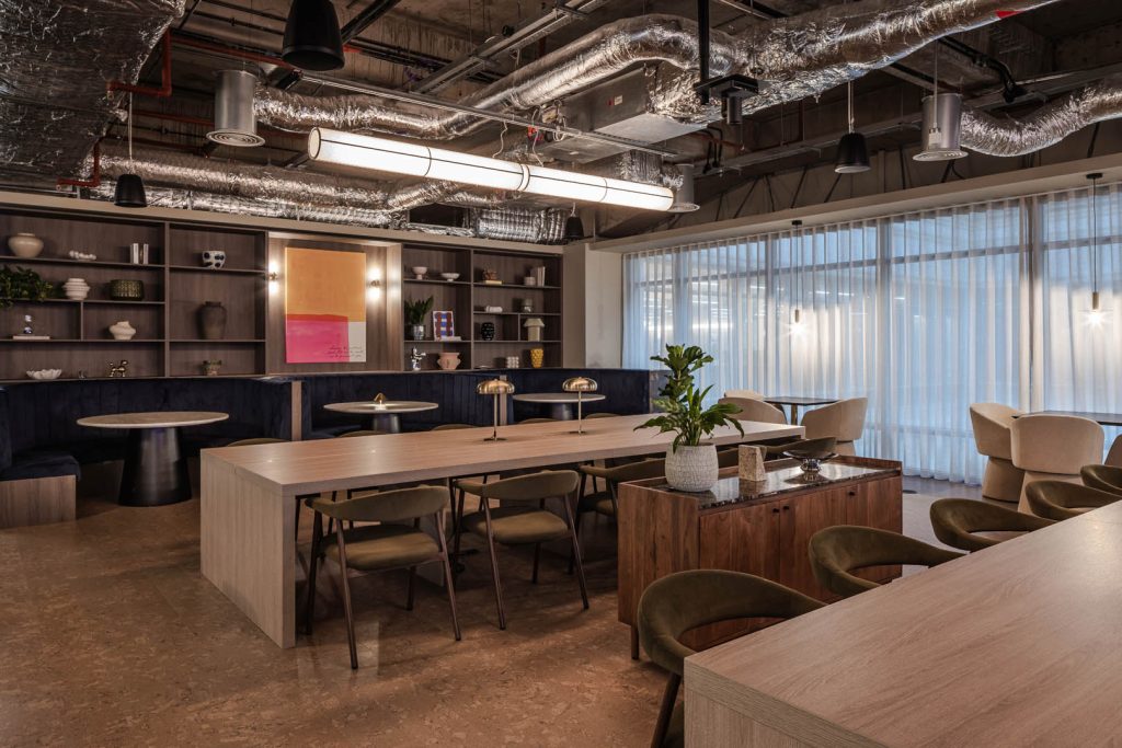 The Bloom Lounge creates a welcoming first impression for drop-in workers and visitors, with the Bloom Room extending this area as a flexible space that doubles up as a training room when required. At the heart of the workspace sits The Greenhouse, a multifunctional hub serving as an alternative work setting, social space with gaming facilities, food preparation area, and event space for large gatherings.