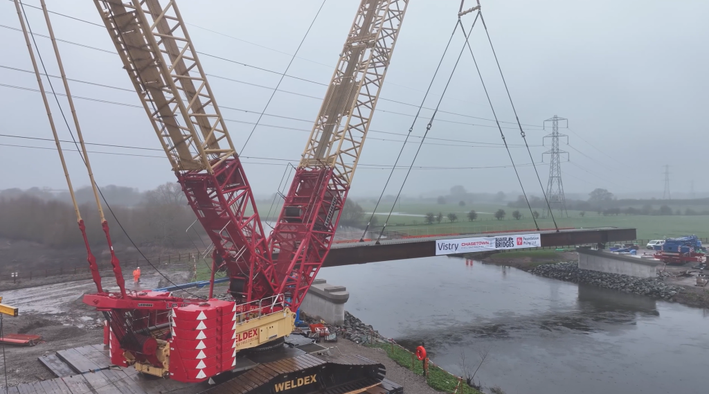 Local leaders joined Vistry, the UK’s leading provider of mixed-tenure homes, and principal contractor Chasetown Civil Engineering, to watch a 600-tonne crawler crane lift the first major span of the new Walton Bridge over the River Trent.