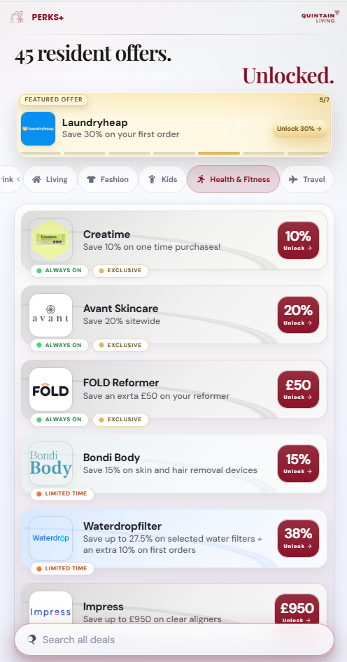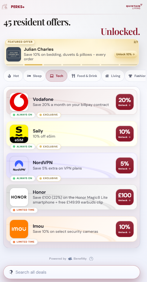 Seamlessly integrated within Quintain Living’s award-winning Resident App, Quintain Living’s Perks+, powered by Benefitty, delivers significant savings for residents on a wide range of everyday and lifestyle spending from groceries to consumer electronics, health and wellbeing, clothing and household goods.
